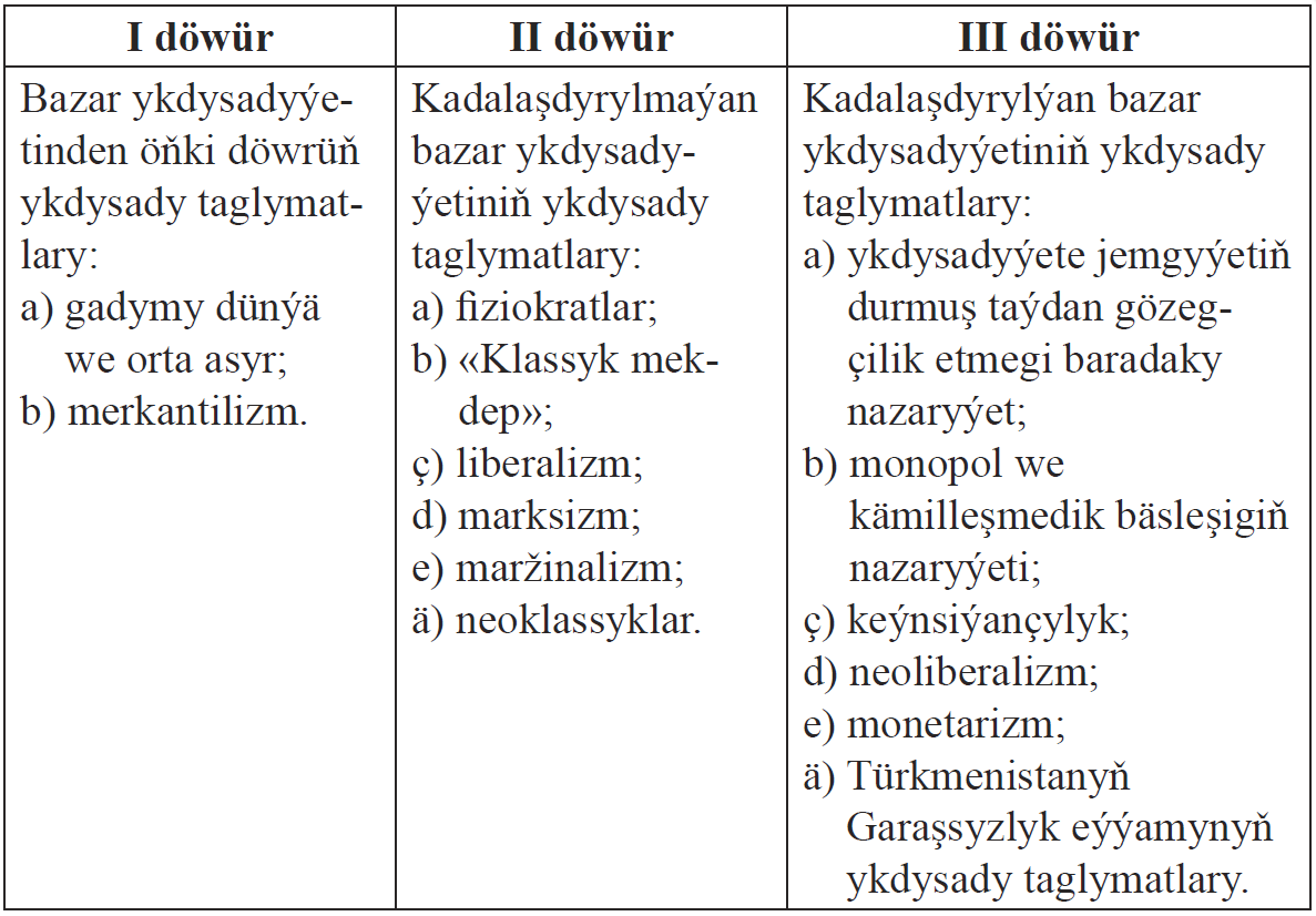 Ykdysady taglymatlaryň taryhynyň üçünji döwrüne Türkmenistanyň Garaşsyzlyk eýýamynyň ykdysady taglymatlary hem girýär. Bu döwürde Türkmenistanyň bazar ykdysadyýetine geçiş ýoly nazary taýdan esaslandyryldy. Türkmenistan bazar ykdysadyýetine kem-kemden, tapgyrlaýyn geçýär. Bazaryň hereket etmeginiň esasy şertleri bolan eýeçiligiň köpgörnüşliliginiň, döwlet eýeçiligini hususylaşdyrmagyň, telekeçiligi ösdürmegiň, bäsleşik göreşiniň, milli walýutanyň girizilmeginiň zerurlygy barada, döwletiň ykdysadyýetde orny hakynda we başga-da ençeme meseleler boýunça ylmy taglymatlar döredildi we durmuşa ornaşdyrylýar.